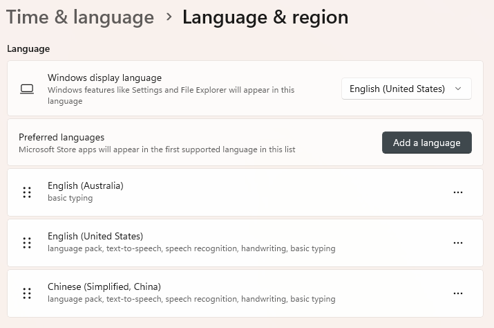 From the Windows Start menu go to Settings and click on Time & Language. Then click on Language & Region and you will see which languages you have installed.